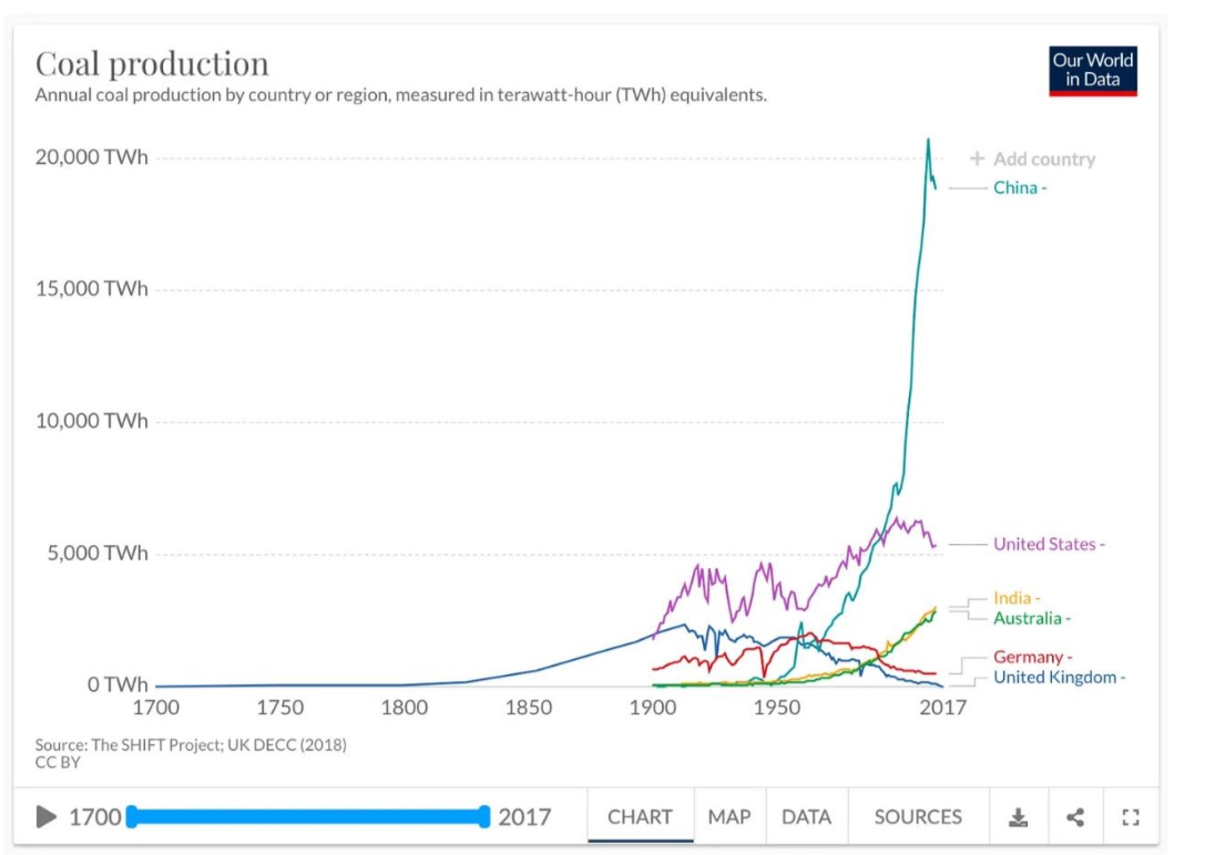 Para poner esto en perspectiva: el consumo de carbón de China en menos de dos décadas eclipsa el consumo combinado de carbón de todas las demás naciones en los dos siglos y medio anteriores. Como dice Tooze , esto representa «una ruptura repentina y radical con toda la historia humana».