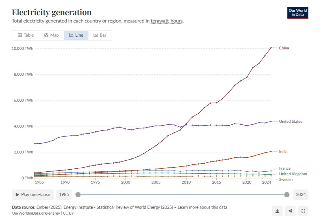 La generación de electricidad de China aumentó de niveles modestos en 2000 a más de 10.000 TWh en 2024, más del doble de la producción estadounidense.