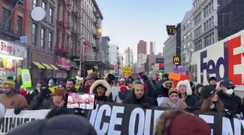 En Foley Square, en Nueva York, los manifestantes levantaron carteles con lemas como «protestar contra el ICE no es un delito» y «justicia para todas las víctimas del terror del ICE«, antes de iniciar una marcha por las calles de Manhattan.