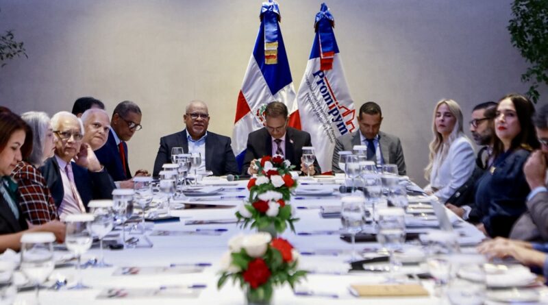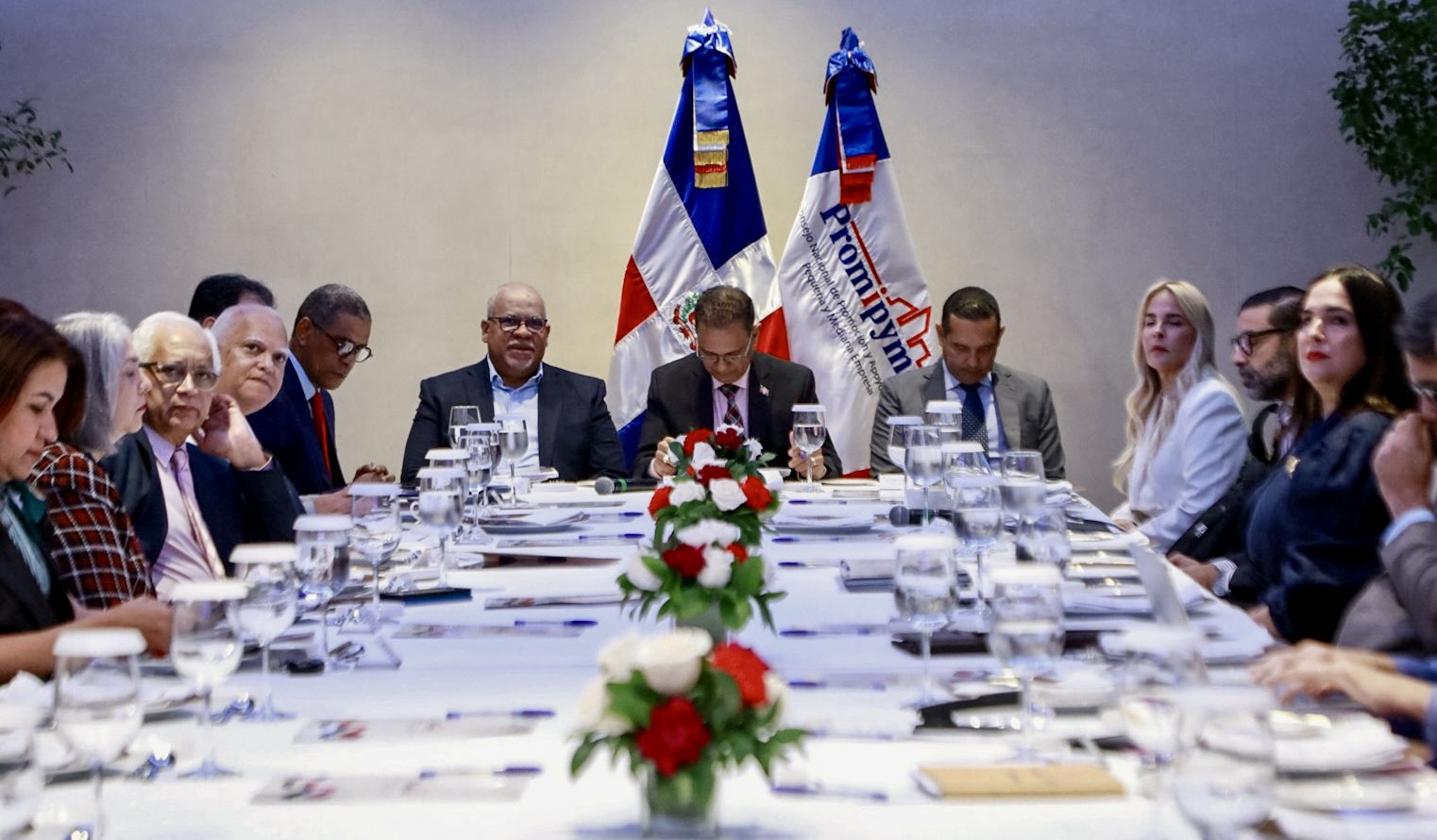 Presentes en la reunión: Jorge Morales Paulino, viceministro de Fomento a la Mipymes; Fabricio Ernesto Gómez Mazara, Director General Consejo Nacional de Promoción y Apoyo a la Micro, Mediana y Pequeña Empresa (Promipyme); Miguel Puente, Asesor Financiero; Doris Laura Uribe, en representación de Leonardo Aguilera, presidente Ejecutivo Banco de Reservas de la República Dominicana; Raysa Pichardo, directora de Competitividad Empresarial; Yarisabel Marmolejos, del Departamento de Registro y Calificación Industrial; Fernando Pinale, presidente de la Confederación de la Pequeña y Mediana Empresa ( Codopyme); Luis Joaquin Miura Ramirez, representante del sector Industrial; Ramon Tejada, representante del sector Comercio; Isaachart Burgos Garcia, representante del sector Cooperativo.