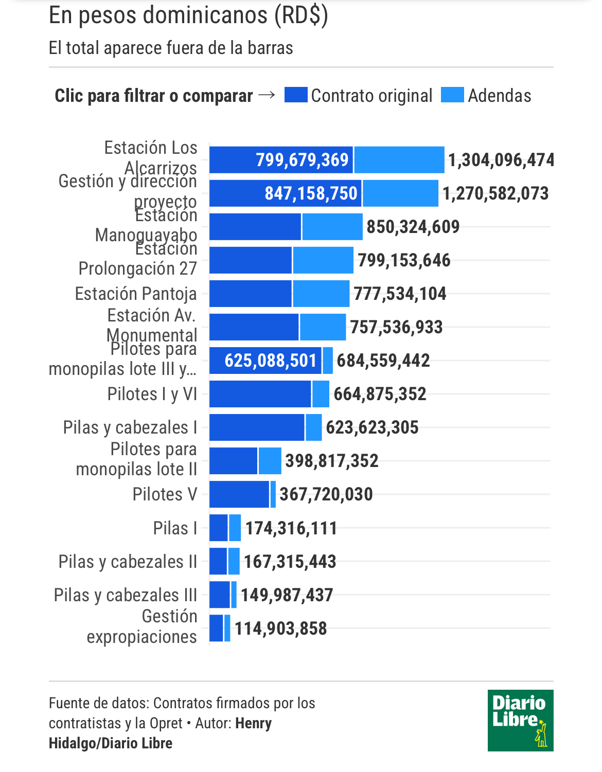 Así, por ejemplo, el contrato de «Gestión de proyectos (project manager) y dirección de las obras civiles requeridas para la construcción de la Línea 2C del Metro de Santo Domingo» no contemplaba la marginal de la obra. Para incluirla se aprobaron 30.4 millonesadicionales en la segunda de cuatro adendas.