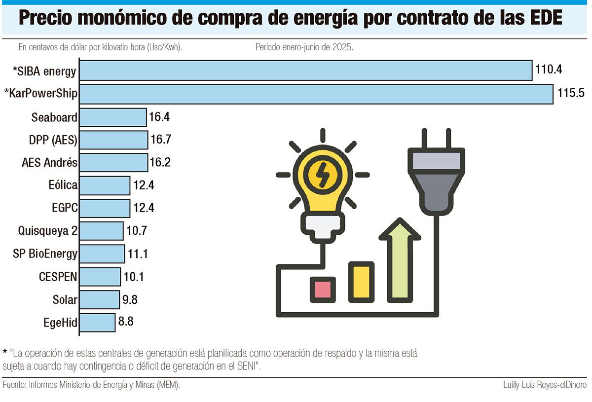 Un levantamiento mes por mes hecho por elDinero sobre la data del MEM indica que en el primer semestre de este año el precio de venta promedio de KarPowerShip a las EDE promedió los 115.5 centavos de dólar por kilovatio hora (USc/Kwh), mientras que la de SIBA Energy fue vendida a las EDE a razón de 110.4 USc/Kwh.