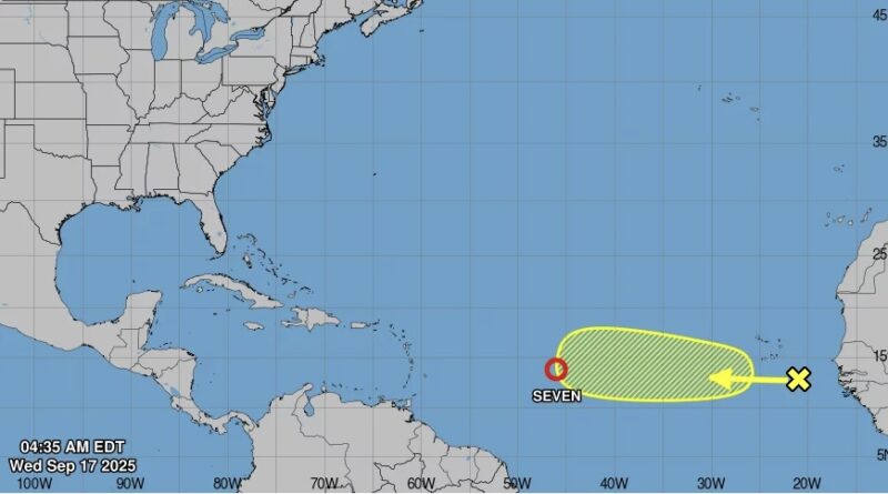 La zona de aguaceros y tormentas eléctricas asociada a una onda tropical ubicada en el Atlántico tropical central alcanzó esta madrugada la categoría de Depresión Tropical No. 7, informó Instituto Dominicano de Meteorología (Indomet).