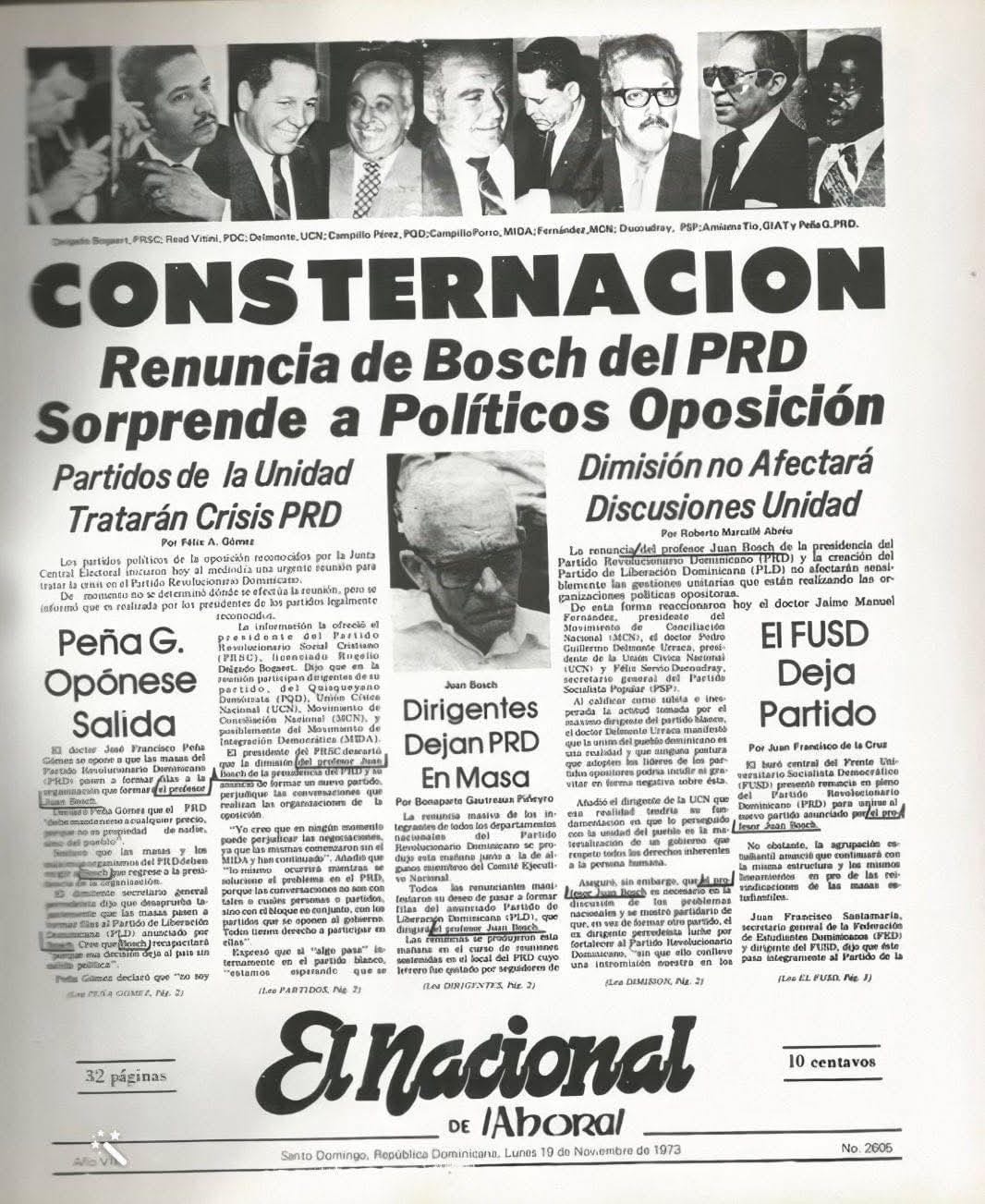 El 18 de noviembre de 1973 se produjo la renuncia del Profesor Juan Bosch de la Presidencia y membresía del Partido Revolucionario Dominicano