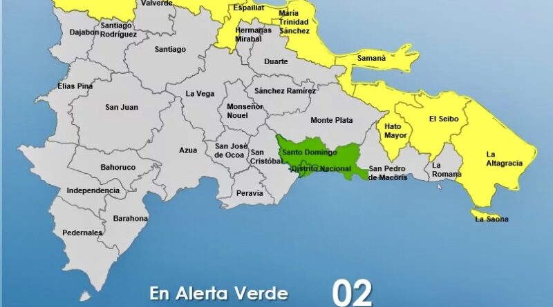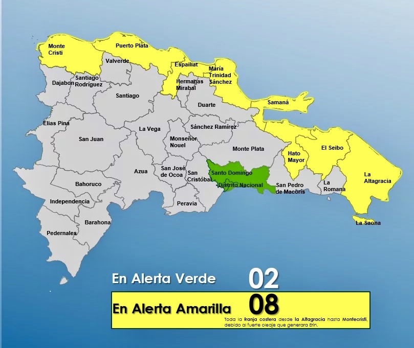 La entidad colocó en alerta verde a Santo Domingo y el Distrito Nacional, mientras que en amarilla, dispuso La Altagracia, Hato Mayor, María Trinidad Sánchez, Montecristi, El Seibo, Samaná, Espaillat, y Puerto Plata.