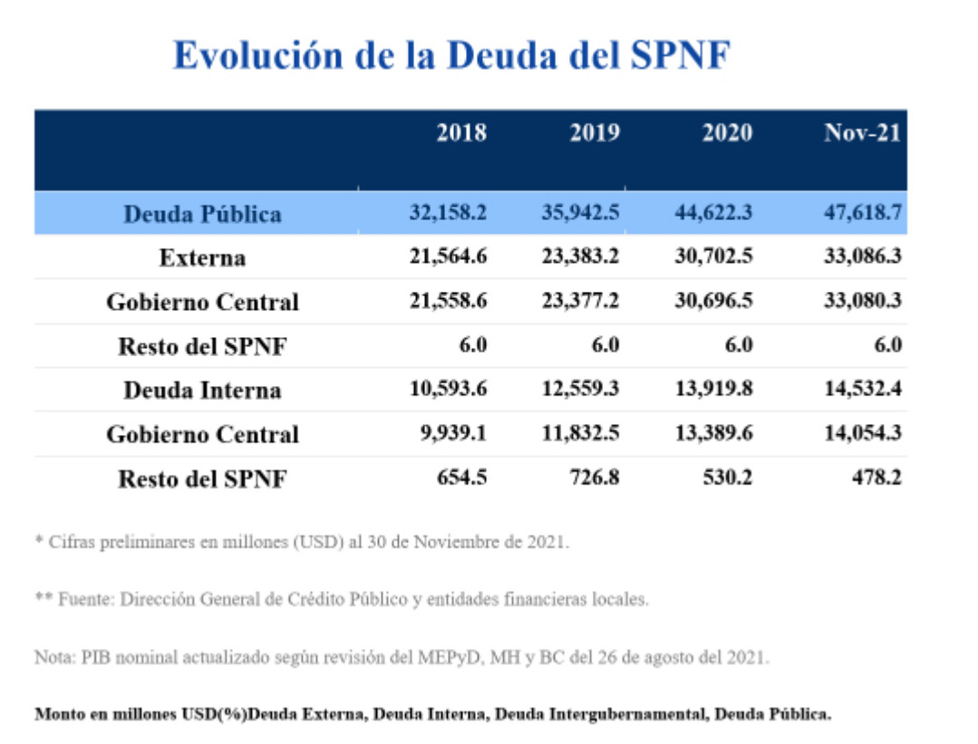 La tendencia, como se advierte desde 2018, es de un rápido crecimiento. La deuda del SPNF terminó ese año en 32,158.2 millones de dólares; en 2019, ascendió a US$35,942.5 millones; en 2020, en medio de la pandemia y una campaña feroz por la lucha por el poder, se disparó a US$44,622-3 millones, y acaba de finalizar como vimos en US$47,618.7 millones. Pero no bien entraba el 2022, el Congreso Nacional inició la rumba de financiamientos. Aprobó mediante dos instrumentos 500 millones de dólares, para el combate del COVID-19. El año pasado ese órgano validó financiamientos por un monto US$1,669 millones.