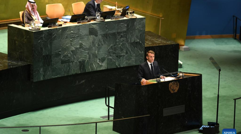 NACIONES UNIDAS, 22 septiembre, 2025 (Xinhua) — Delegados aplauden mientras el presidente francés, Emmanuel Macron, habla durante la Conferencia Internacional de Alto Nivel para la Solución Pacífica de la Cuestión de Palestina y la Implementación de la Solución de dos Estados, en la sede de la Organización de las Naciones Unidas (ONU), en Nueva York, el 22 de septiembre de 2025. Macron dijo el lunes en una reunión de la ONU sobre la solución de dos Estados que su país reconoce al Estado de Palestina, con lo que se une a la mayoría de los demás Estados miembros de la ONU que ya lo han hecho. (Xinhua/Li Rui)