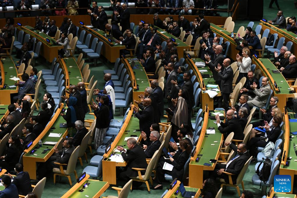NACIONES UNIDAS, 22 septiembre, 2025 (Xinhua) — Miembros de la delegación de Palestina aplauden durante la Conferencia Internacional de Alto Nivel para la Solución Pacífica de la Cuestión de Palestina y la Implementación de la Solución de dos Estados, en la sede de la Organización de las Naciones Unidas (ONU), en Nueva York, el 22 de septiembre de 2025. El presidente francés, Emmanuel Macron, dijo el lunes en una reunión de la ONU sobre la solución de dos Estados que su país reconoce al Estado de Palestina, con lo que se une a la mayoría de los demás Estados miembros de la ONU que ya lo han hecho. (Xinhua/Li Rui)