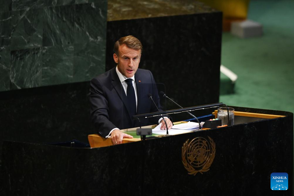 NACIONES UNIDAS, 22 septiembre, 2025 (Xinhua) — El presidente francés, Emmanuel Macron, habla durante la Conferencia Internacional de Alto Nivel para la Solución Pacífica de la Cuestión de Palestina y la Implementación de la Solución de dos Estados, en la sede de la Organización de las Naciones Unidas (ONU), en Nueva York, el 22 de septiembre de 2025. Macron dijo el lunes en una reunión de la ONU sobre la solución de dos Estados que su país reconoce al Estado de Palestina, con lo que se une a la mayoría de los demás Estados miembros de la ONU que ya lo han hecho. (Xinhua/Li Rui)