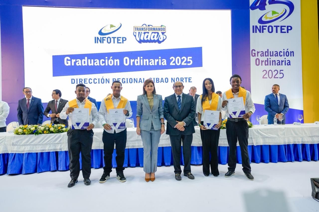 La graduación fue encabezada por la vicepresidenta de la República, Raquel Peña, y Rafael Santos Badía, director general del INFOTEP, en una ceremonia que reunió a graduandos de las Direcciones Regionales Cibao Norte, Cibao Sur y Cibao Nordeste.