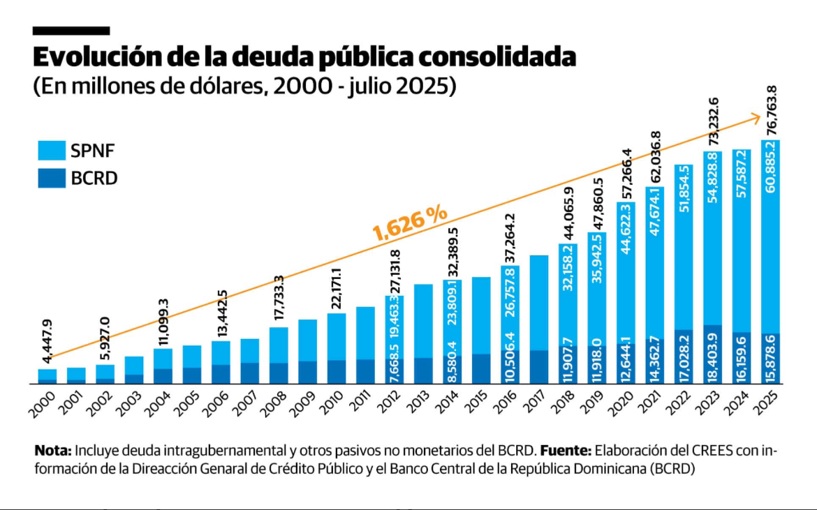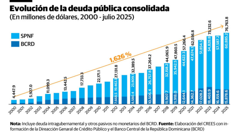 A julio de 2025, la deuda pública consolidada ascendió a 76,763.8 millones de dólares. Este monto está compuesto por la deuda del Sector Público No Financiero (SPNF), que fue de 60,885.2 millones de dólares, y la deuda del Banco Central de la República Dominicana (BCRD), que representó 15,878.6 millones de dólares.