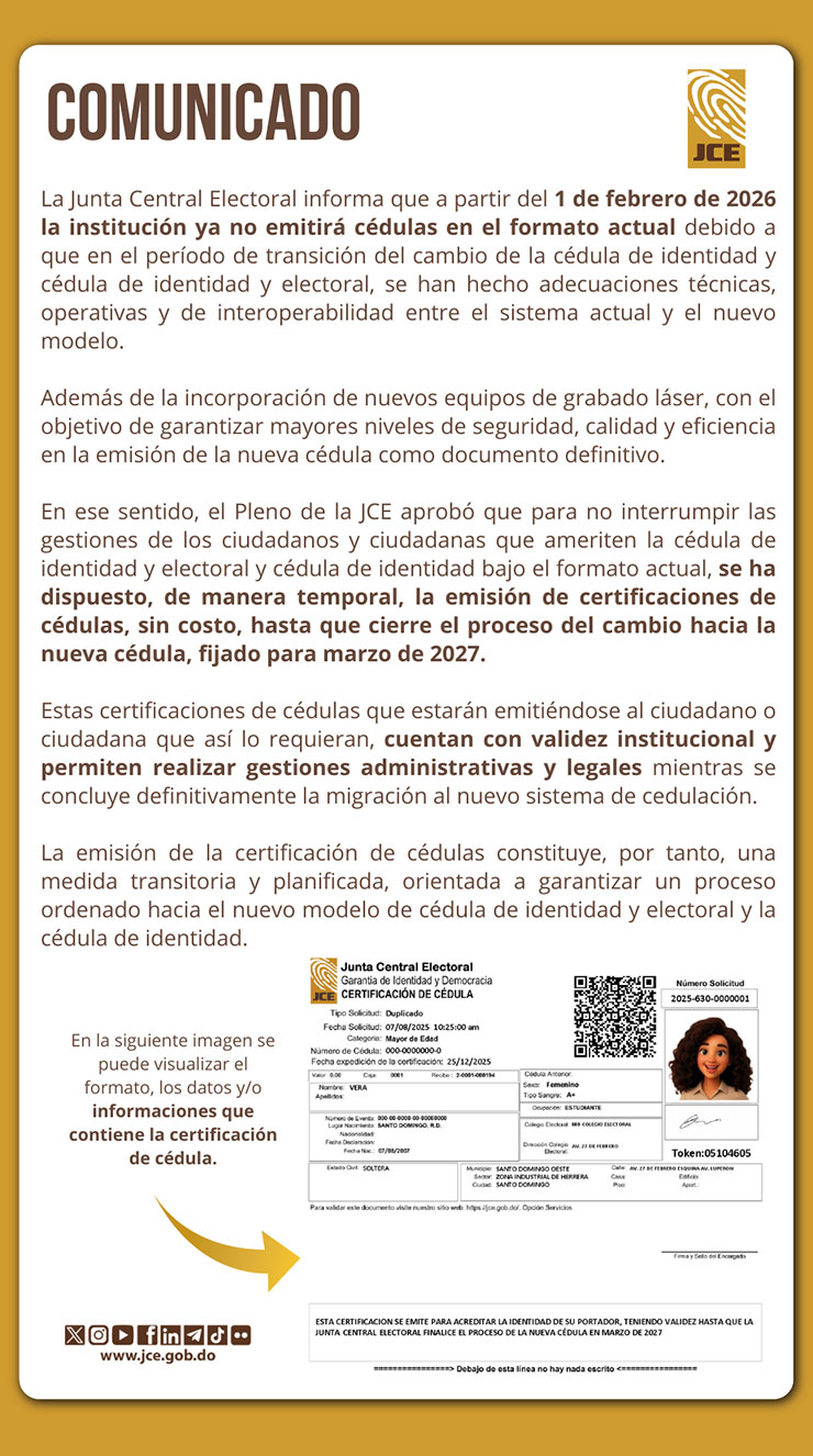 “La emisión de la certificación de cédulas constituye, por tanto, una medida transitoria y planificada, orientada a garantizar un proceso ordenado hacia el nuevo modelo de cédula de identidad y electoral y la cédula de identidad”, dijo la JCE.