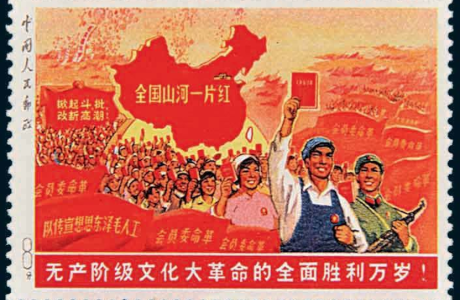 Imagen: Sello de la Revolución Cultural «Viva la victoria general de la Gran Revolución Cultural Proletaria» (Segundo borrador) cancelado y emitido por la República Popular China. Número original del sello: Wen 14, nombre de la imagen: obreros, campesinos, soldados y mapas, tamaño: 60mm × 40mm, valor facial: 8 puntos. Dominio público, Enlace