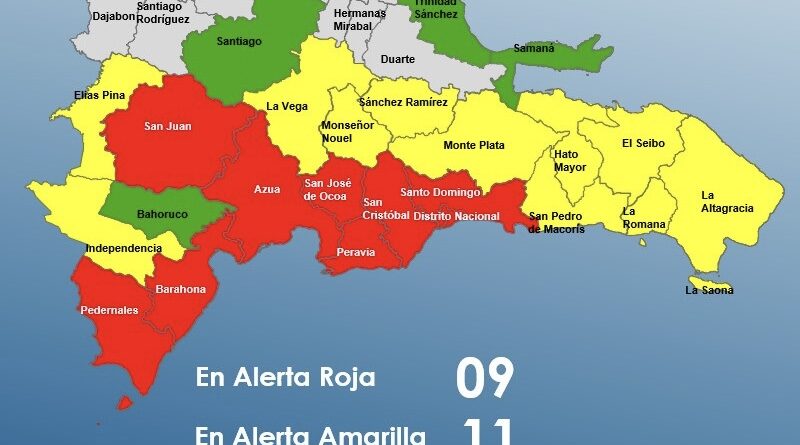 Mientras que en alerta verde se encuentran Bahoruco, Santiago,María Trinidad Sánchez ySamaná.