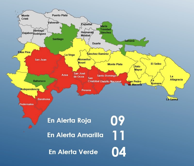 Mientras que en alerta verde se encuentran Bahoruco, Santiago,María Trinidad Sánchez ySamaná.