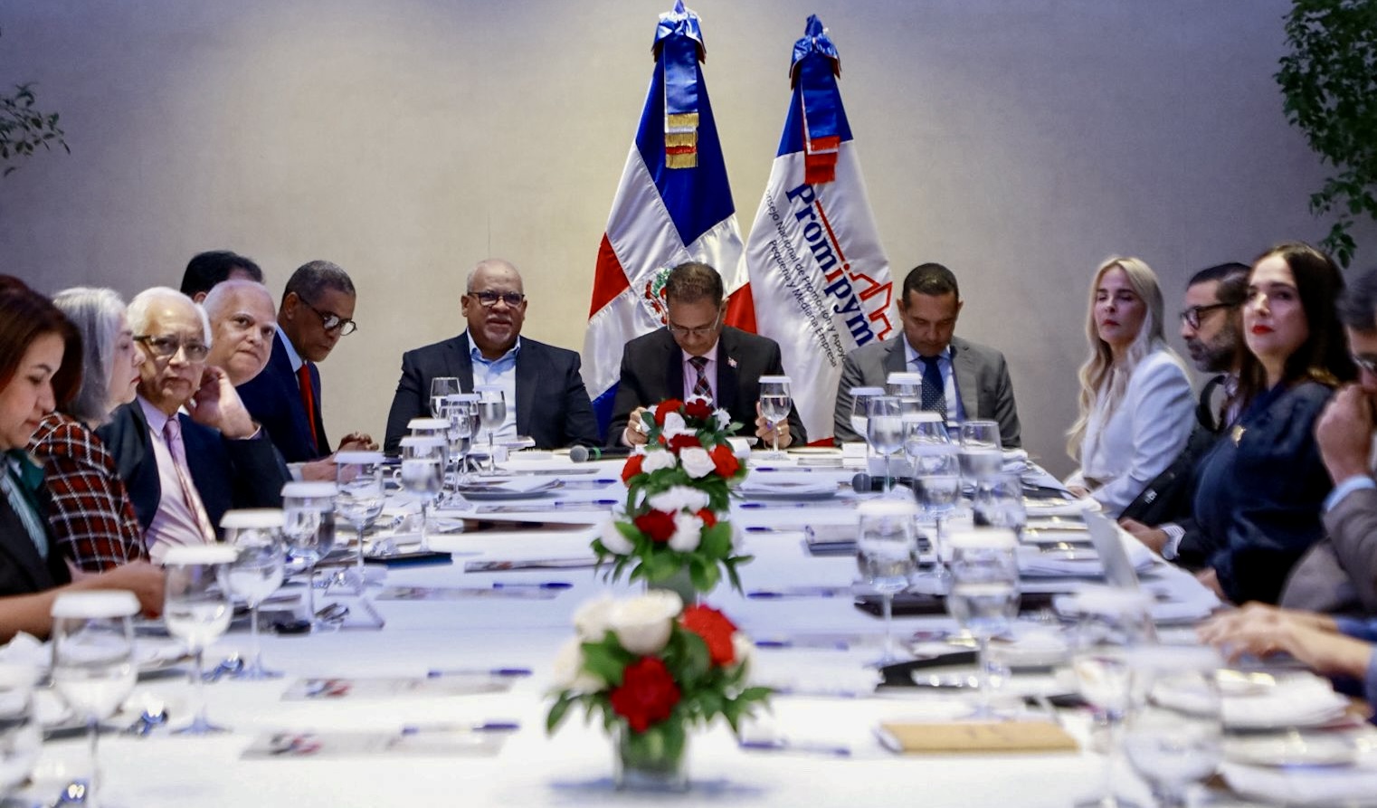 Presentes en la reunión: Jorge Morales Paulino, viceministro de Fomento a la Mipymes; Fabricio Ernesto Gómez Mazara, Director General Consejo Nacional de Promoción y Apoyo a la Micro, Mediana y Pequeña Empresa (Promipyme); Miguel Puente, Asesor Financiero; Doris Laura Uribe, en representación de Leonardo Aguilera, presidente Ejecutivo del Banco de Reservas de la República Dominicana; Raysa Pichardo, directora de Competitividad Empresarial; Yarisabel Marmolejos, del Departamento de Registro y Calificación Industrial; Fernando Pinales,, presidente de la Confederación de la Pequeña y Mediana Empresa ( Codopyme); Luis Joaquin Miura Ramirez, representante del sector Industrial; Ramon Tejada, representante del sector Comercio; Isaachart Burgos Garcia, representante del sector Cooperativo.
