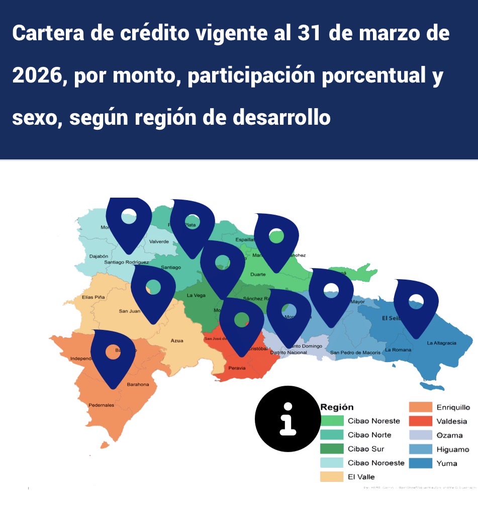 También muestran las estadísticas de “ la Cartera de crédito” vigente al 31 de marzo de 2026, por monto, participación porcentual y sexo, según región de desarrollo:
