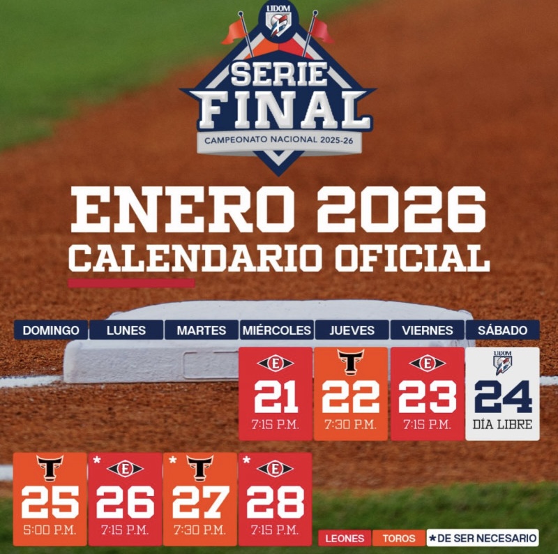 La Liga de Béisbol Profesional de República Dominicana(Lidom) presentó el calendario de la Serie Final 2026, que enfrentará a Toros del Este y Leones del Escogido en una serie al mejor de siete partidos.