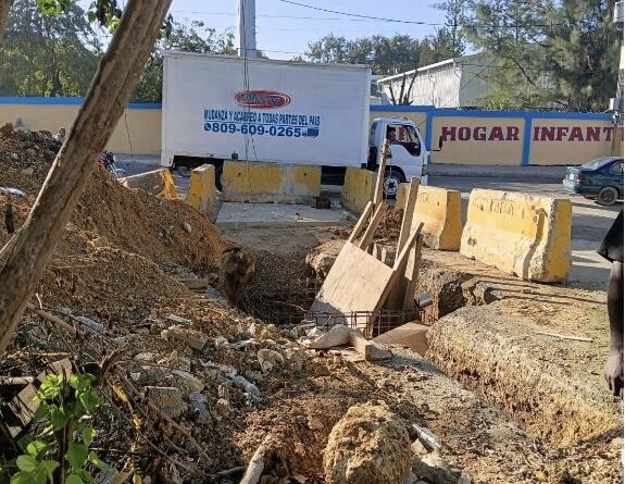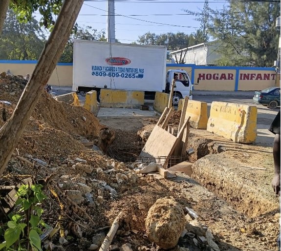 En el lugar se observa una zanja con montículos de tierra extraída y barreras de seguridad en un extremo, presuntamente para la instalación de tuberías del sistema de agua potable.